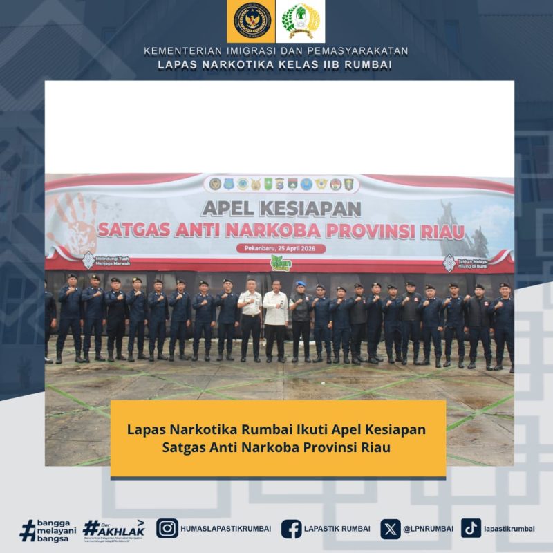 VeranNews.com..Pekanbaru — Kepala Kantor Wilayah Direktorat Jenderal Pemasyarakatan Riau, Maizar, memenuhi undangan Apel Kesiapan Satuan Tugas (Satgas) Anti Narkoba Provinsi Riau yang dilaksanakan di Halaman Kantor Gubernur Riau, Sabtu (25/04/2026). Kehadiran ini menjadi bentuk dukungan nyata terhadap penguatan sinergi lintas instansi dalam upaya pencegahan dan pemberantasan narkoba di wilayah Riau, dalam hal ini Lapas Narkotika Kelas IIB Rumbai turut mengirim petugas perwakilannya untuk menghadiri undangan tersebut.